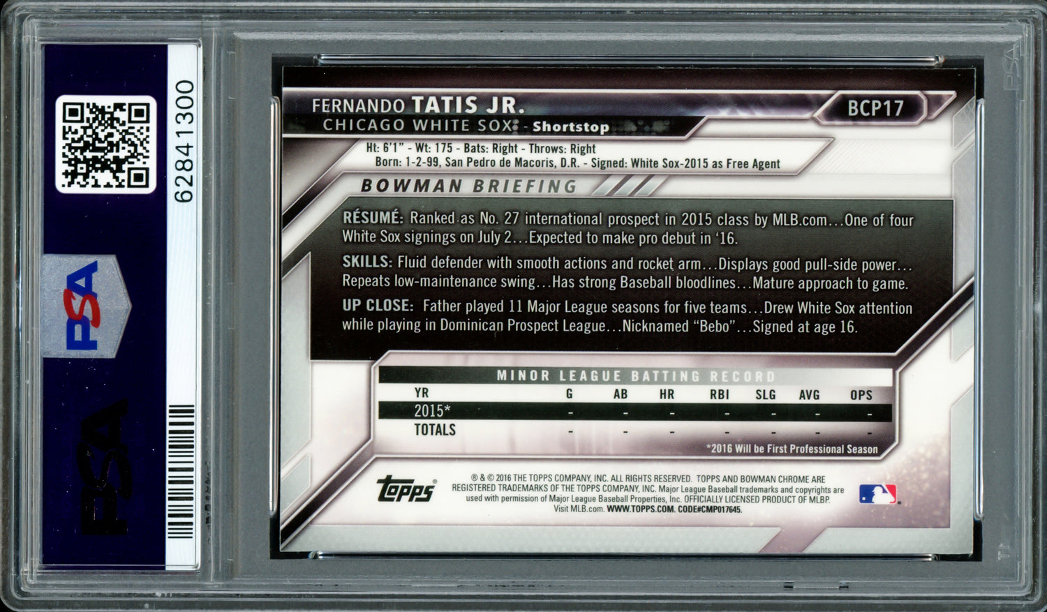 Own a piece of baseball history with this 2016 Bowman Chrome Prospects Rookie Card #BCP17, personally hand-signed by Fernando Tatis Jr.. This highly coveted card is a must-have for collectors and fans of the San Diego Padres superstar. Professionally authenticated and graded by PSA/DNA, this card is a premium investment in sports memorabilia.