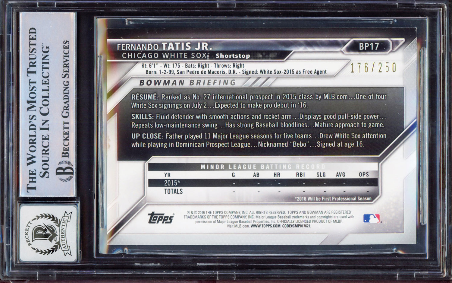 Fernando Tatis Jr. Autographed 2016 Bowman Prospect Purple Rookie Card #BP17 San Diego Padres BGS 8.5 Auto Grade Gem Mint 10 #176/250 Beckett BAS #15350633