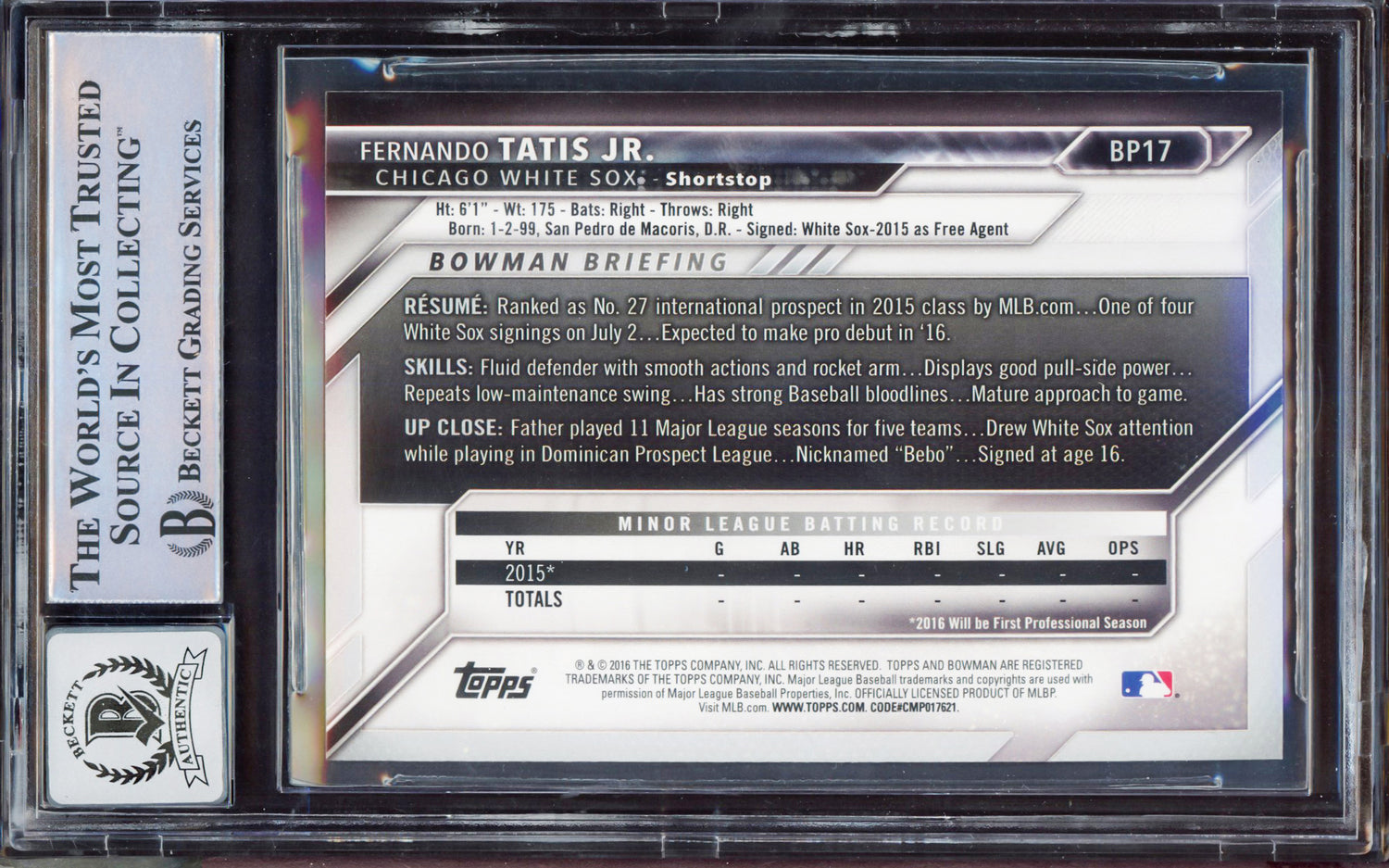 Fernando Tatis Jr. Autographed 2016 Bowman Prospect Yellow Rookie Card #BP17 San Diego Padres BGS 9 Auto Grade Gem Mint 10 Beckett BAS Stock #212268