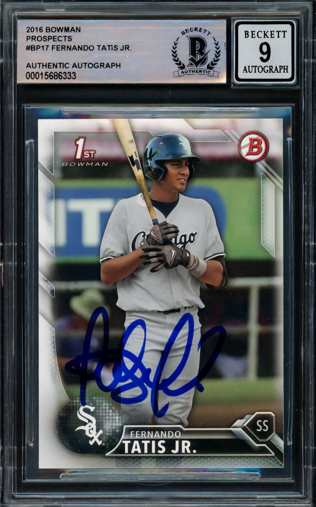 Own a piece of baseball history with this 2016 Bowman Prospects Rookie Card #BP17, personally hand-signed by Fernando Tatis Jr. This highly collectible card has been certified authentic by Beckett Authentication Services (BAS) and comes securely encapsulated in their tamper-proof holder. The signature has been professionally examined and graded a Mint 9 by Beckett BAS, ensuring superior quality and value.