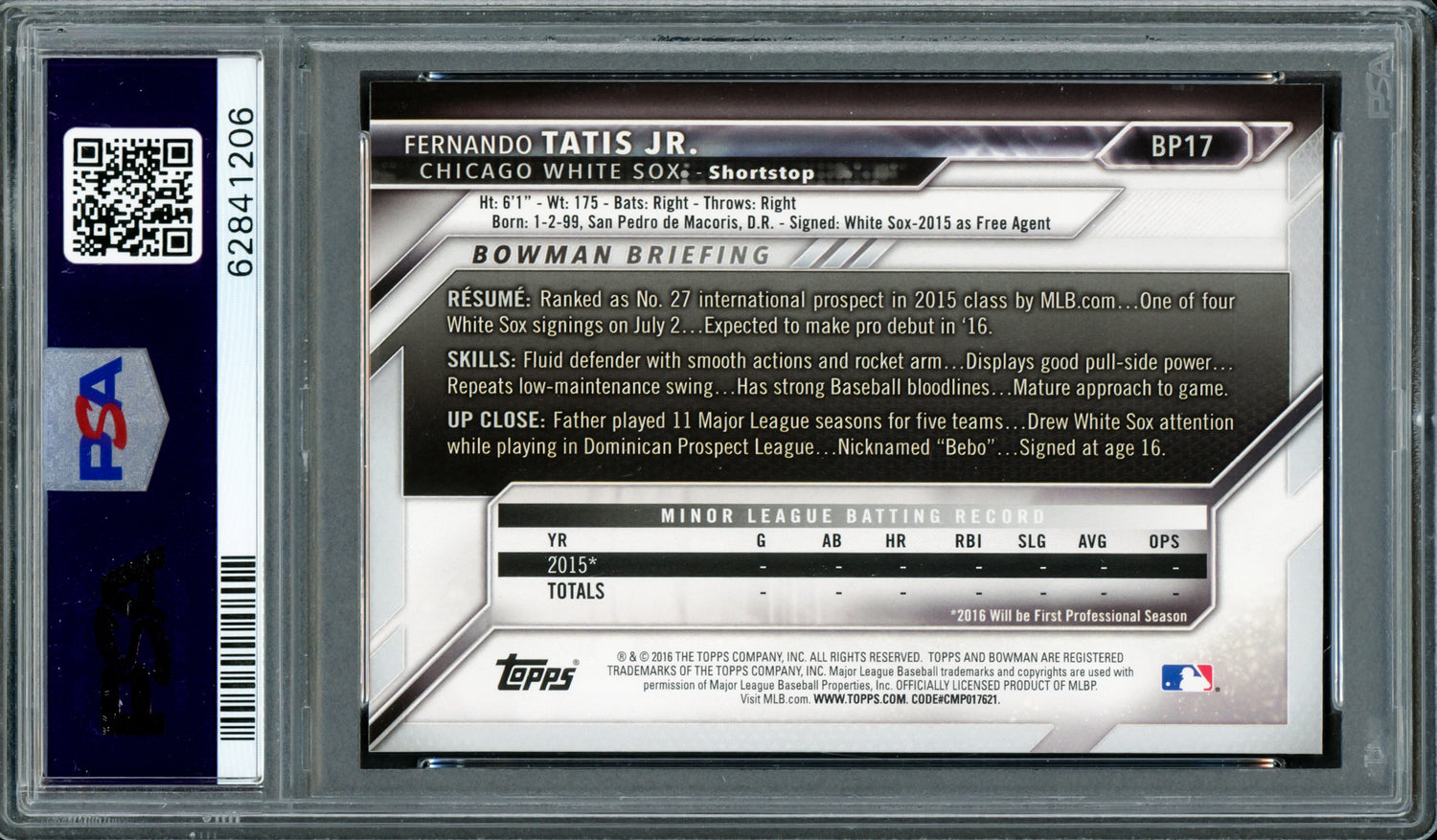 Fernando Tatis Jr. Autographed 2016 Bowman Prospects Rookie Card #BP17 San Diego Padres PSA 10 Auto Grade Gem Mint 10 PSA/DNA #62841206