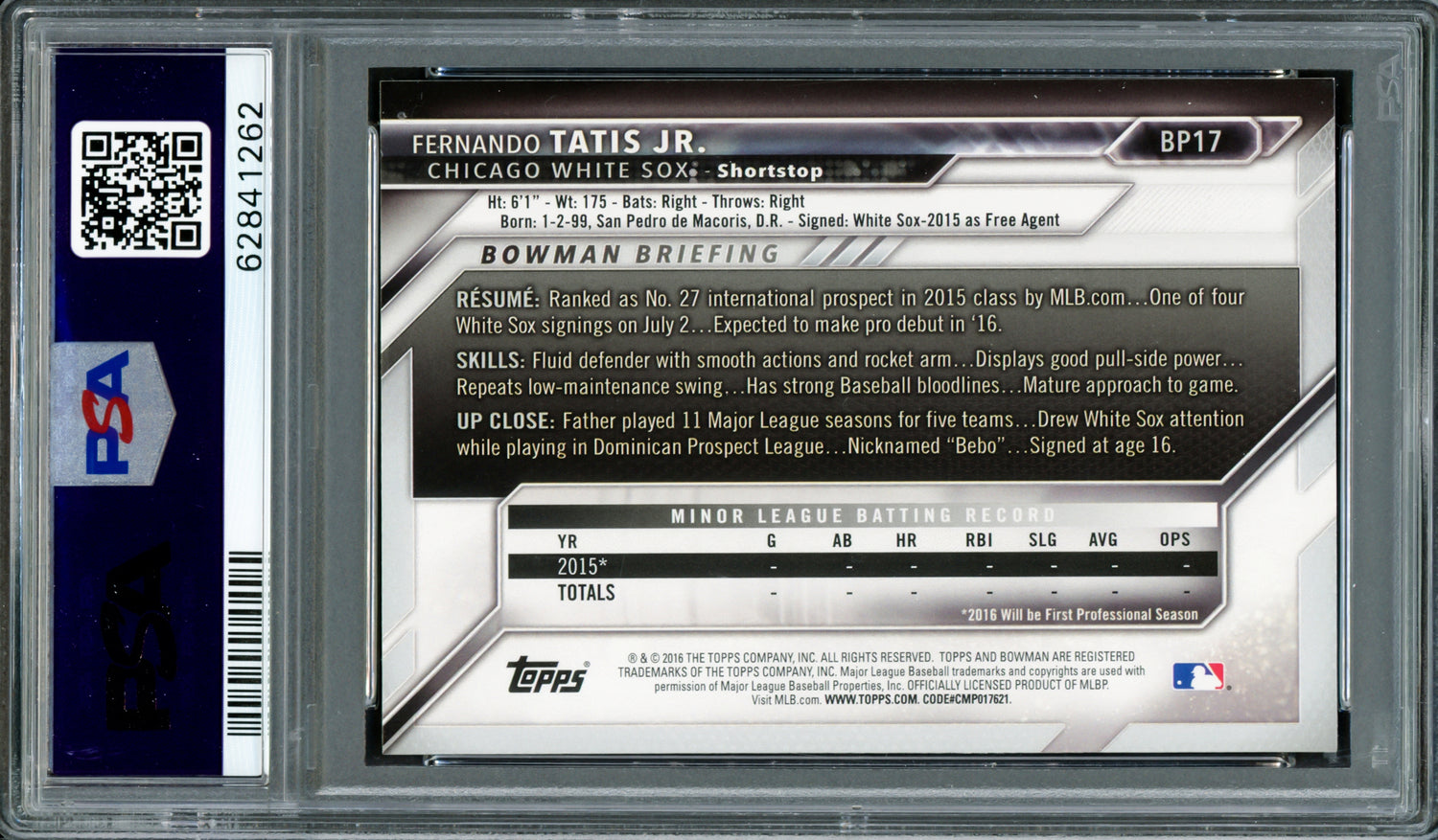 Fernando Tatis Jr. Autographed 2016 Bowman Prospects Rookie Card #BP17 San Diego Padres PSA 9 Auto Grade Gem Mint 10 PSA/DNA #62841262