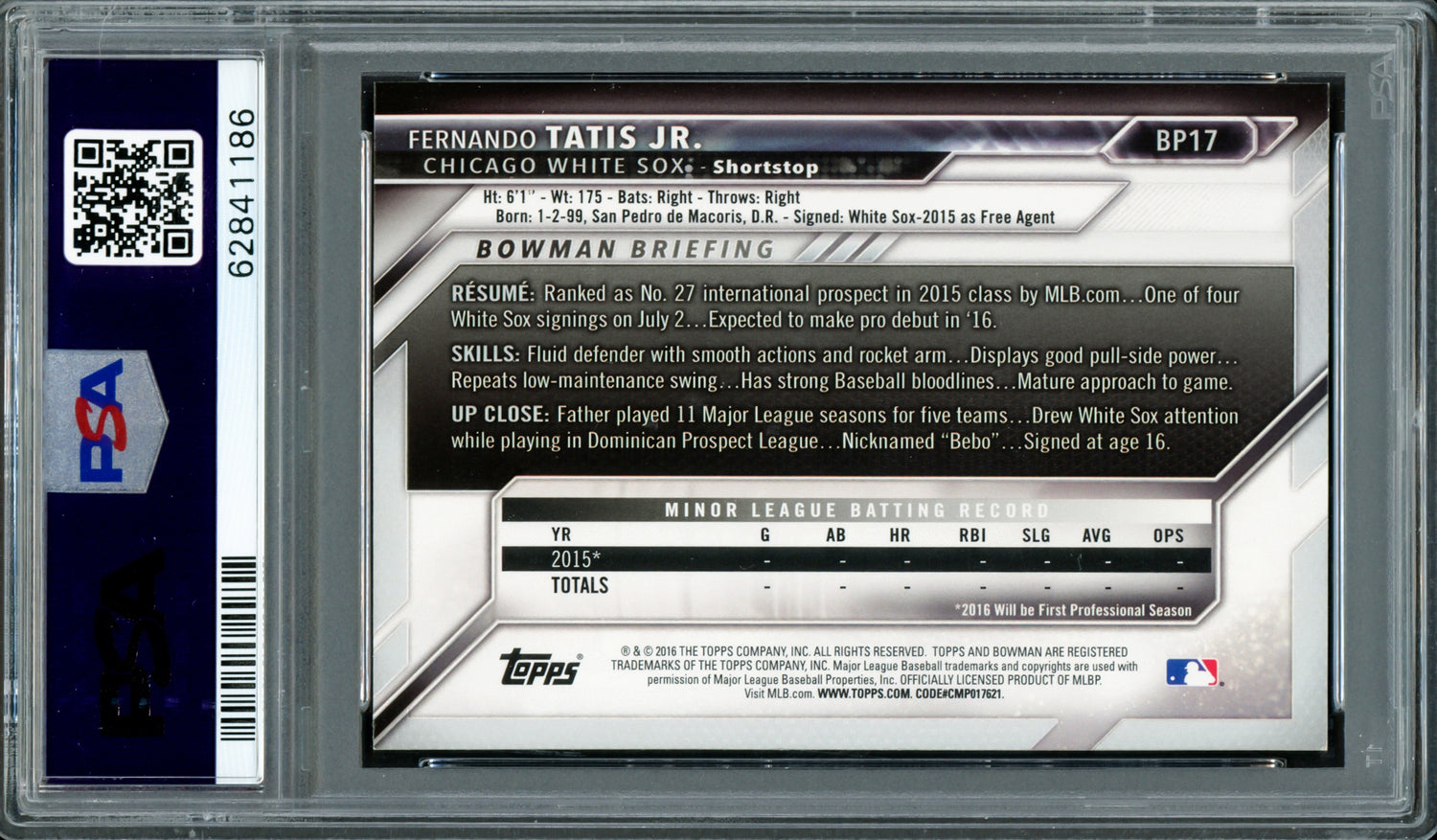 This 2016 Bowman Prospects Yellow Rookie Card #BP17 has been hand-signed by Fernando Tatis Jr., making it a must-have for serious baseball card collectors and San Diego Padres fans. Graded and authenticated by PSA/DNA, this rare piece of memorabilia offers both value and authenticity.