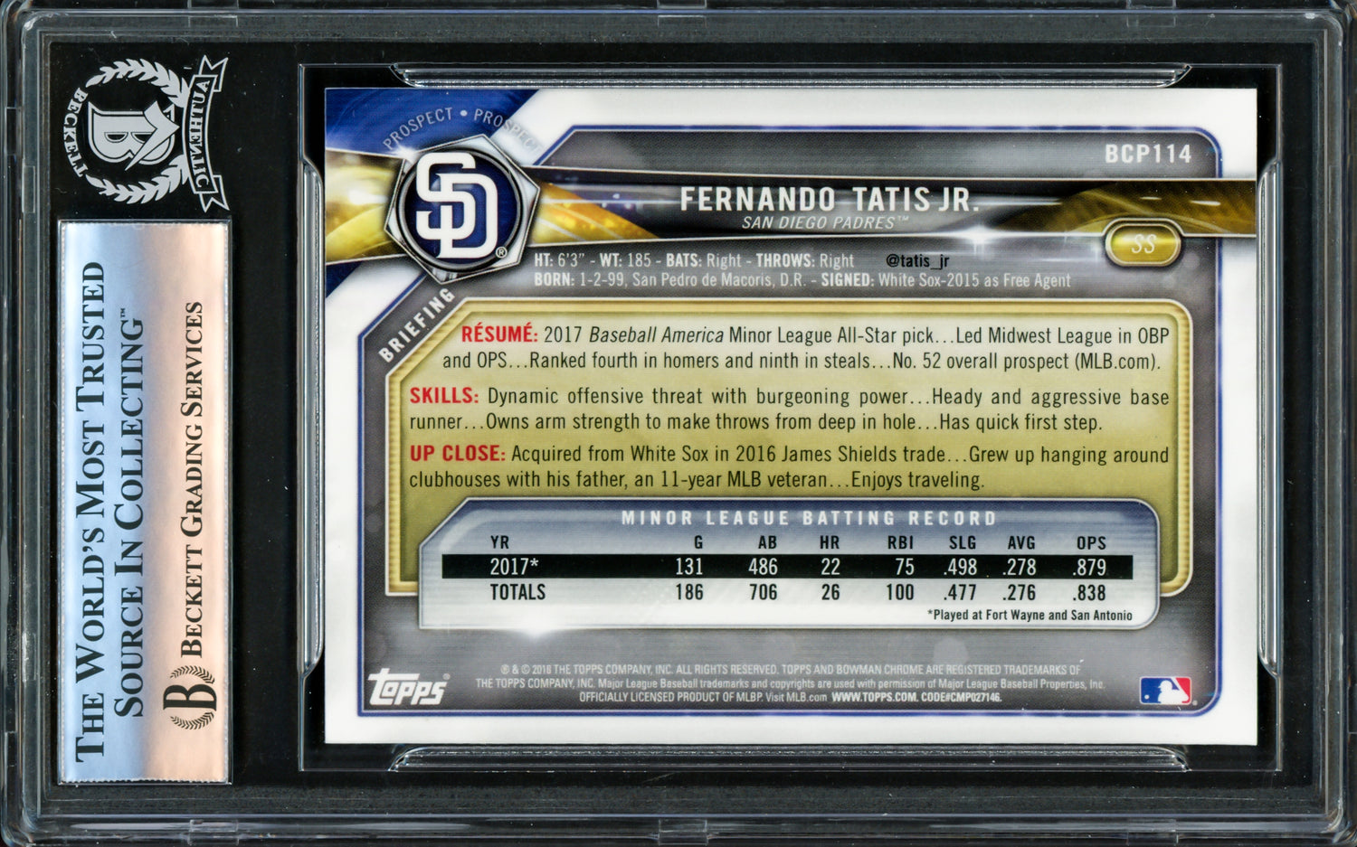 Fernando Tatis Jr. Autographed 2018 Bowman Chrome Prospects Rookie Card #BCP114 San Diego Padres Beckett BAS #16177967