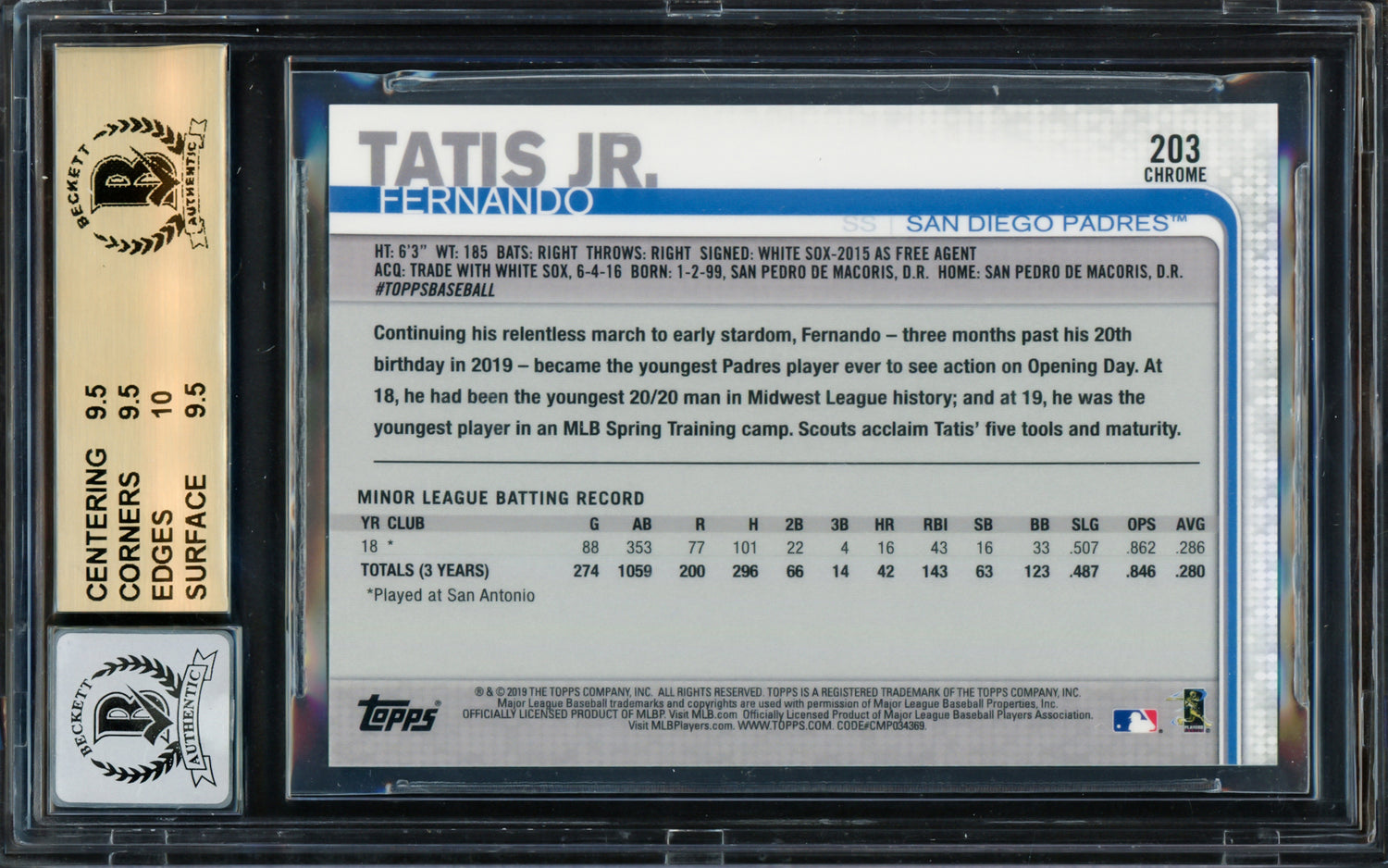 Fernando Tatis Jr. Autographed 2019 Topps Chrome Prizm Refractors Rookie Card #203 San Diego Padres BGS 9.5 Auto Grade Gem Mint 10 Beckett BAS #14984828
