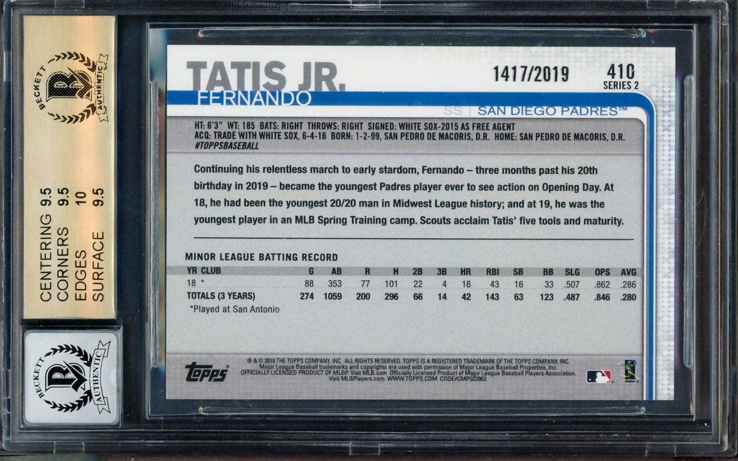 Fernando Tatis Jr. Autographed 2019 Topps Gold Rookie Card #410 San Diego Padres BGS 9.5 Auto Grade Gem Mint 10 Beckett BAS #14323699