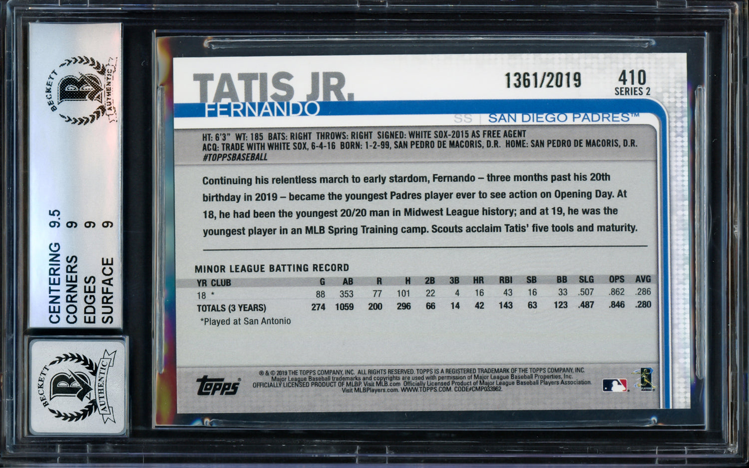 Fernando Tatis Jr. Autographed 2019 Topps Gold Rookie Card #410 San Diego Padres BGS 9 Auto Grade Gem Mint 10 Beckett BAS #14323870