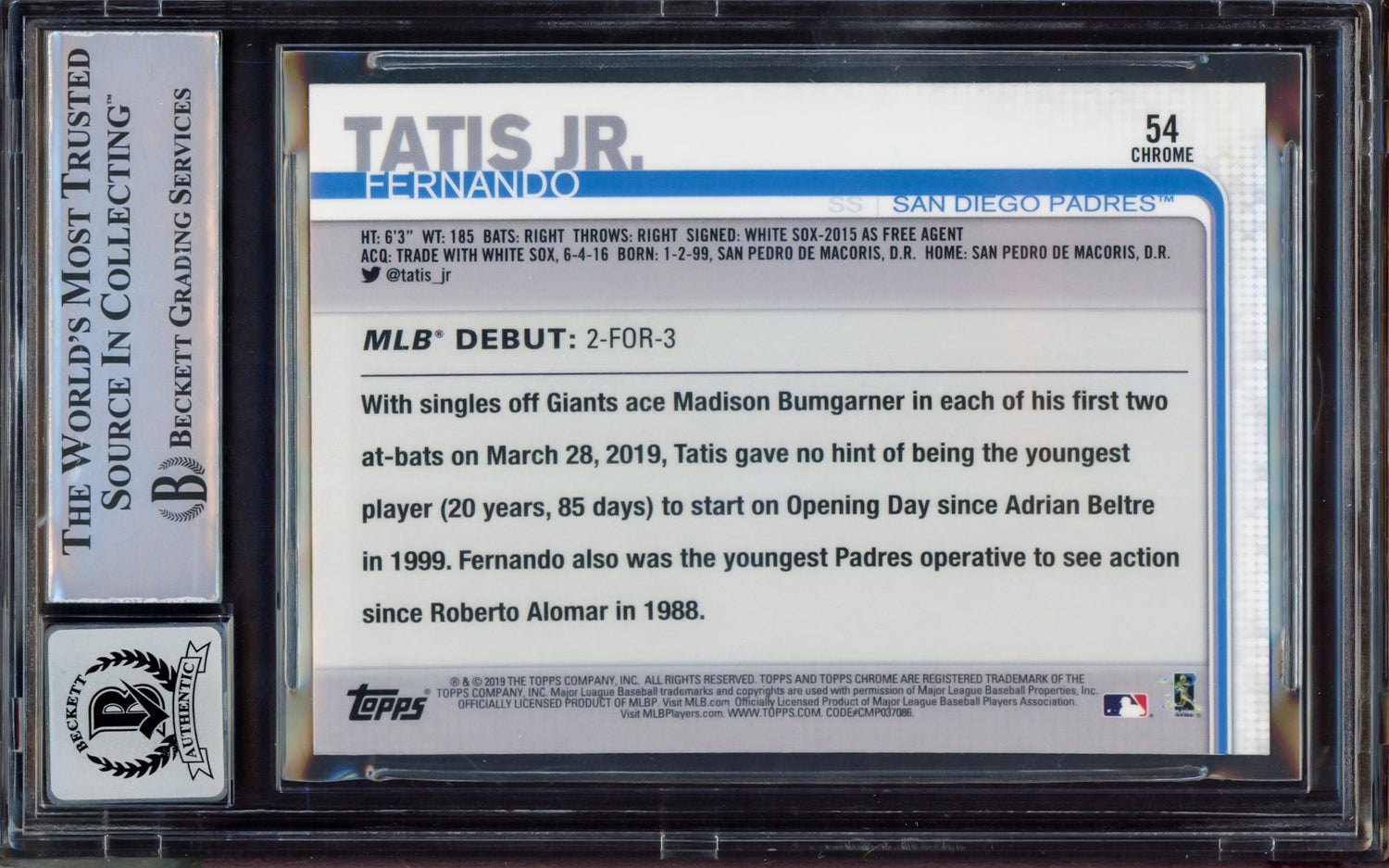 Fernando Tatis Jr. Autographed 2019 Topps Update Rookie Card #US56 San Diego Padres BGS 8.5 Auto Grade Near Mint/Mint 8 Beckett BAS #15469265