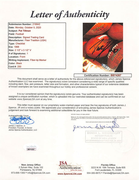 Cardinals Pat Tillman Signed 1998 Fleer Tradition #250 Framed Display JSA LOA