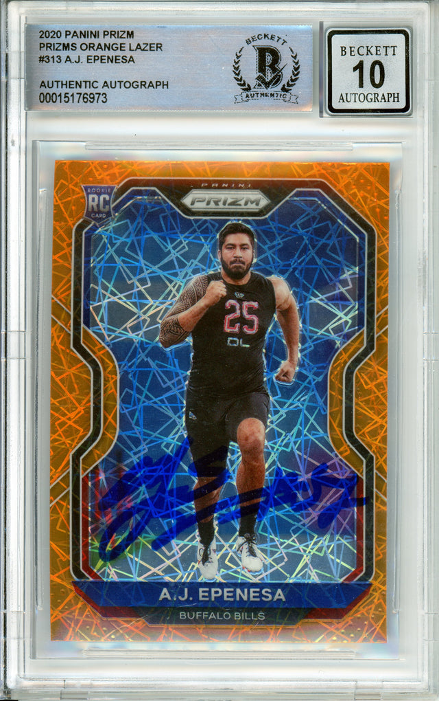 Own a piece of NFL history with the 2020 Panini Prizm Orange Lazer #313 A.J. Epenesa RC Buffalo Bills BAS Autograph 10 sports trading card. This rare rookie card is a must-have for Buffalo Bills fans and serious collectors alike.