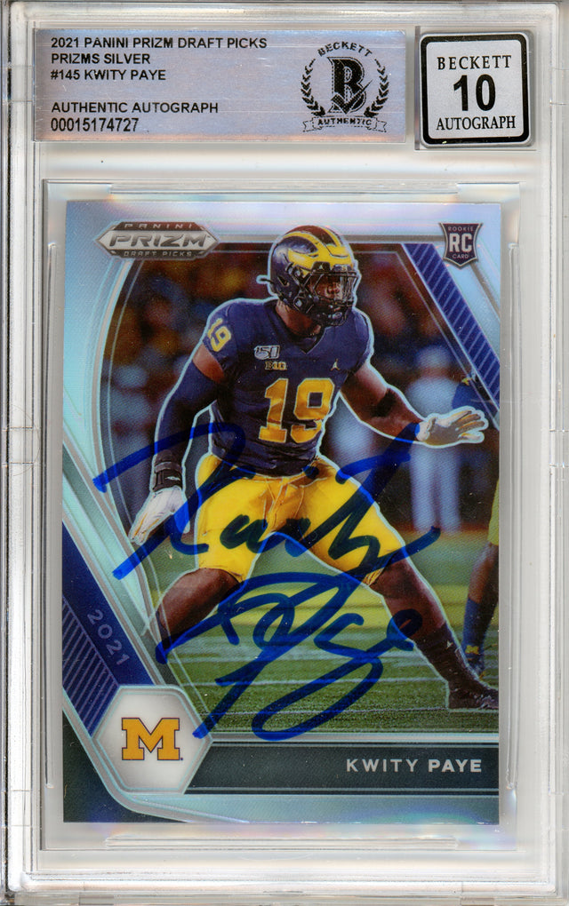 Own a piece of football history with the 2021 Panini Prizm Draft Picks Silver #145 Kwity Paye RC Michigan BAS Autograph 10 trading card! This highly sought-after rookie card features an authentic hand-signed autograph from Kwity Paye, the standout defensive end from the Michigan Wolverines who became a first-round NFL draft pick. Encapsulated and graded BGS Autograph 10, this card is a must-have for collectors and fans alike.