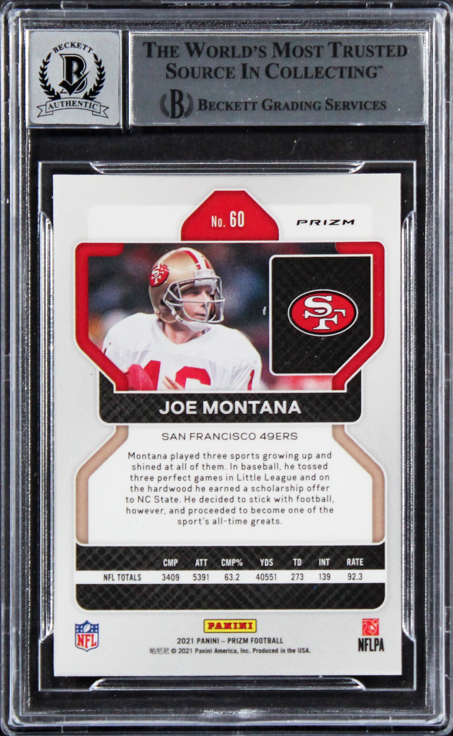 This Joe Montana Autographed 2021 Panini Prizm Lazer #60 Card is a must-have for any devoted San Francisco 49ers fan or serious sports memorabilia collector. Featuring a hand-signed autograph from legendary Hall of Fame quarterback Joe Montana, this rare collectible is professionally graded Gem Mint 10 and securely slabbed by Beckett Authentication Services (BAS) for guaranteed authenticity. Key Features: