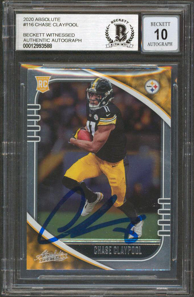 Own a piece of football history with this Autographed Auto Graded Gem Mint 10! 2020 Absolute #116 Rookie Card, personally signed by Chase Claypool of the Pittsburgh Steelers. A must-have for serious collectors and Steelers fans, this high-grade rookie card is an investment in both sports history and future potential.
