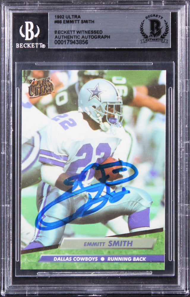 Celebrate one of the greatest running backs in NFL history with this Autographed 1992 Ultra #88 Emmitt Smith Card, a must-have for any Dallas Cowboys fan or serious memorabilia collector. Personally signed by Emmitt Smith, this rare collectible commemorates the iconic Cowboys legend during his Hall of Fame career peak. Protected in a professional slab and authenticated by Beckett Authentication Services (BAS), you can purchase with complete confidence in its authenticity. The signed card’s details are verifiable on the Beckett Authentication Services website. Add a piece of football greatness to your collection with this authentic 1992 card featuring the NFL’s all-time leading rusher.