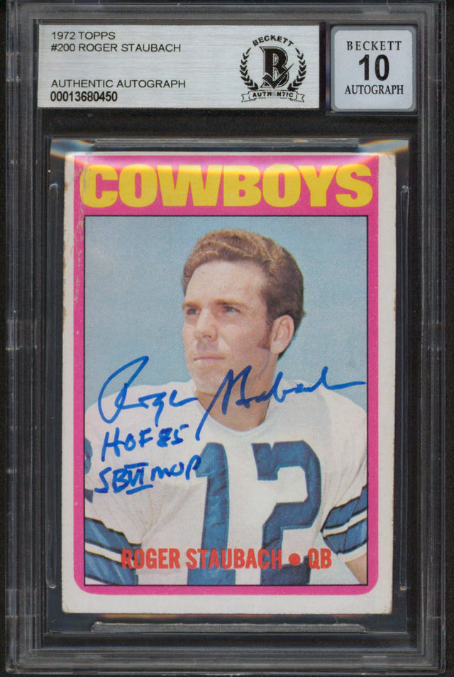 Own a piece of football history with this Autographed Auto Graded Gem Mint 10! 1972 Topps #200 Roger Staubach Rookie Card, personally signed by the legendary Dallas Cowboys quarterback. This rare collectible is further distinguished by the inscription: "HOF 85, SB VI MVP," celebrating Staubach's Hall of Fame induction and iconic Super Bowl VI MVP performance.