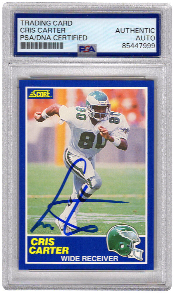 Capture a piece of NFL history with this Cris Carter signed Philadelphia Eagles 1989 Score football rookie trading card #72. This coveted rookie card features Hall of Famer Cris Carter during his early days with the Philadelphia Eagles before his legendary career with the Minnesota Vikings. A must-have for serious collectors and football fans alike, this card blends iconic sports heritage with top-tier authentication. Authenticated and encapsulated by PSA, it offers both long-term value and peace of mind. Authentication can be verified online using its unique PSA certification number.