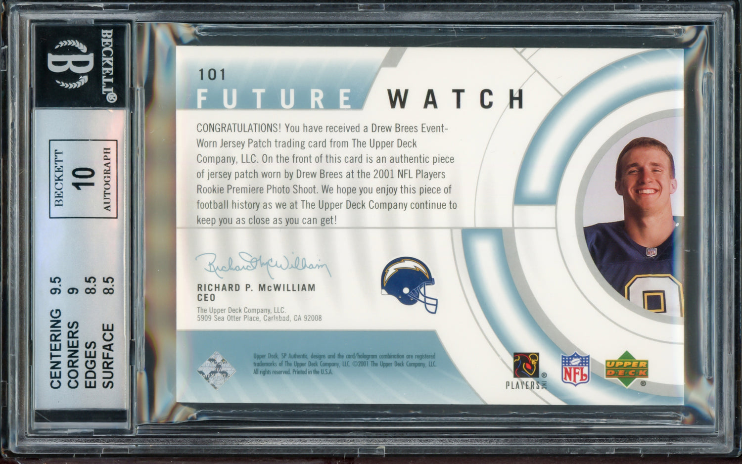Drew Brees Autographed 2001 Upper Deck SP Authentic Rookie Card New Orleans Saints BGS 8.5 Auto Grade Gem Mint 10 Event Worn Patch Beckett BAS #14323832