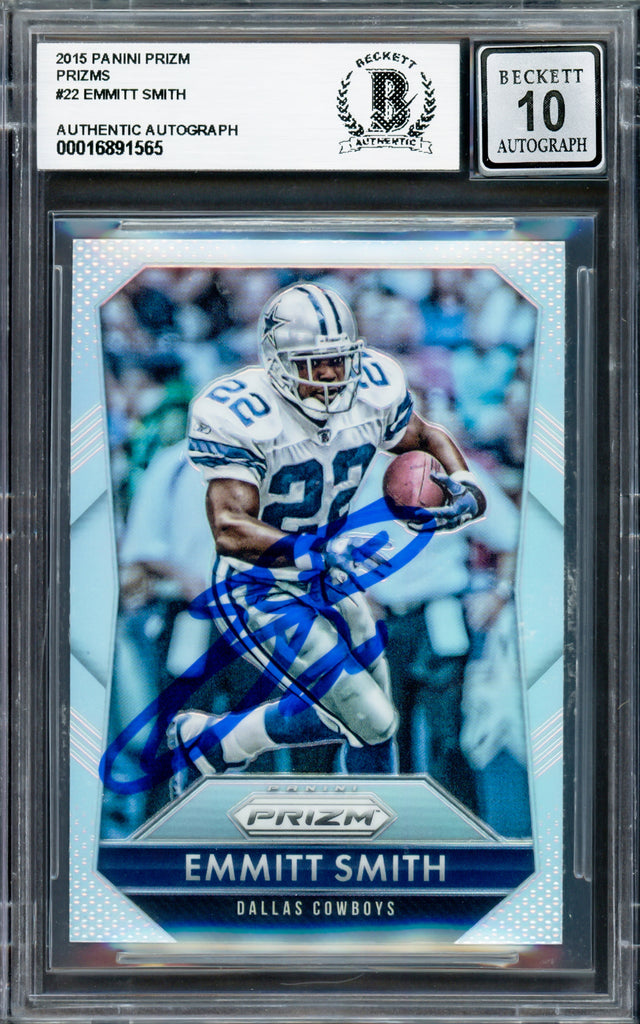 Emmitt Smith Autographed 2015 Panini Prizm Prizms Card #22 Dallas Cowboys Auto Grade Gem Mint 10 Beckett BAS Stock #233573