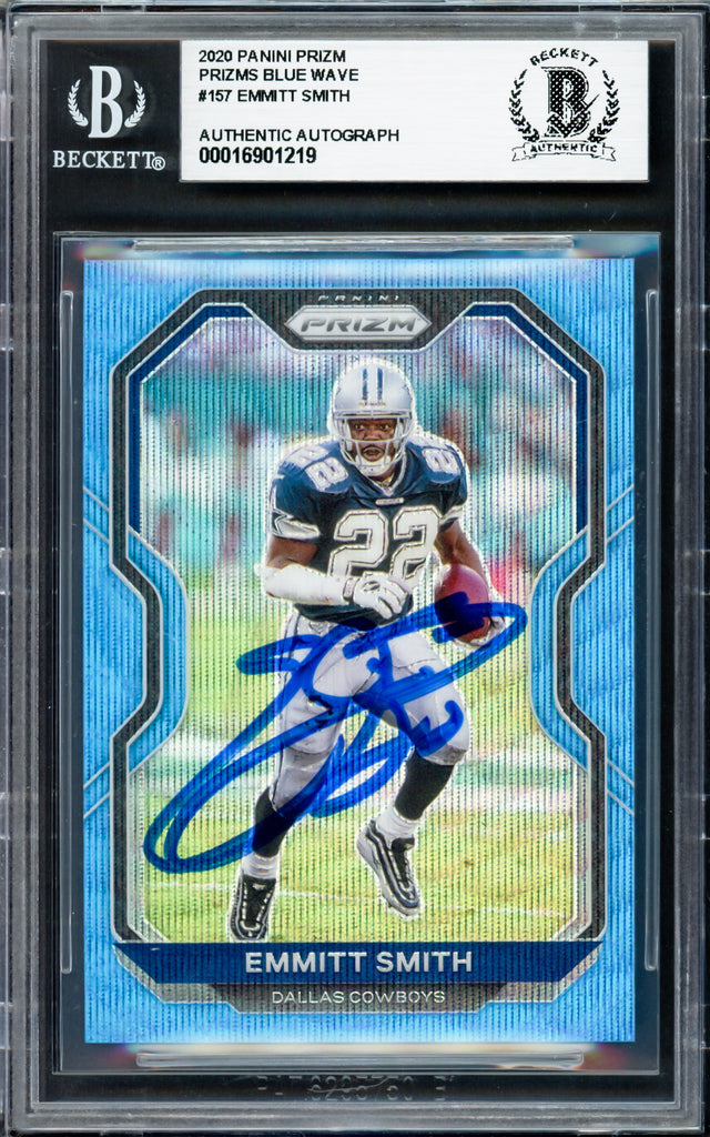 Emmitt Smith Autographed 2020 Panini Prizm Prizms Blue Wave Card #157 Dallas Cowboys #191/199 Beckett BAS #16901219