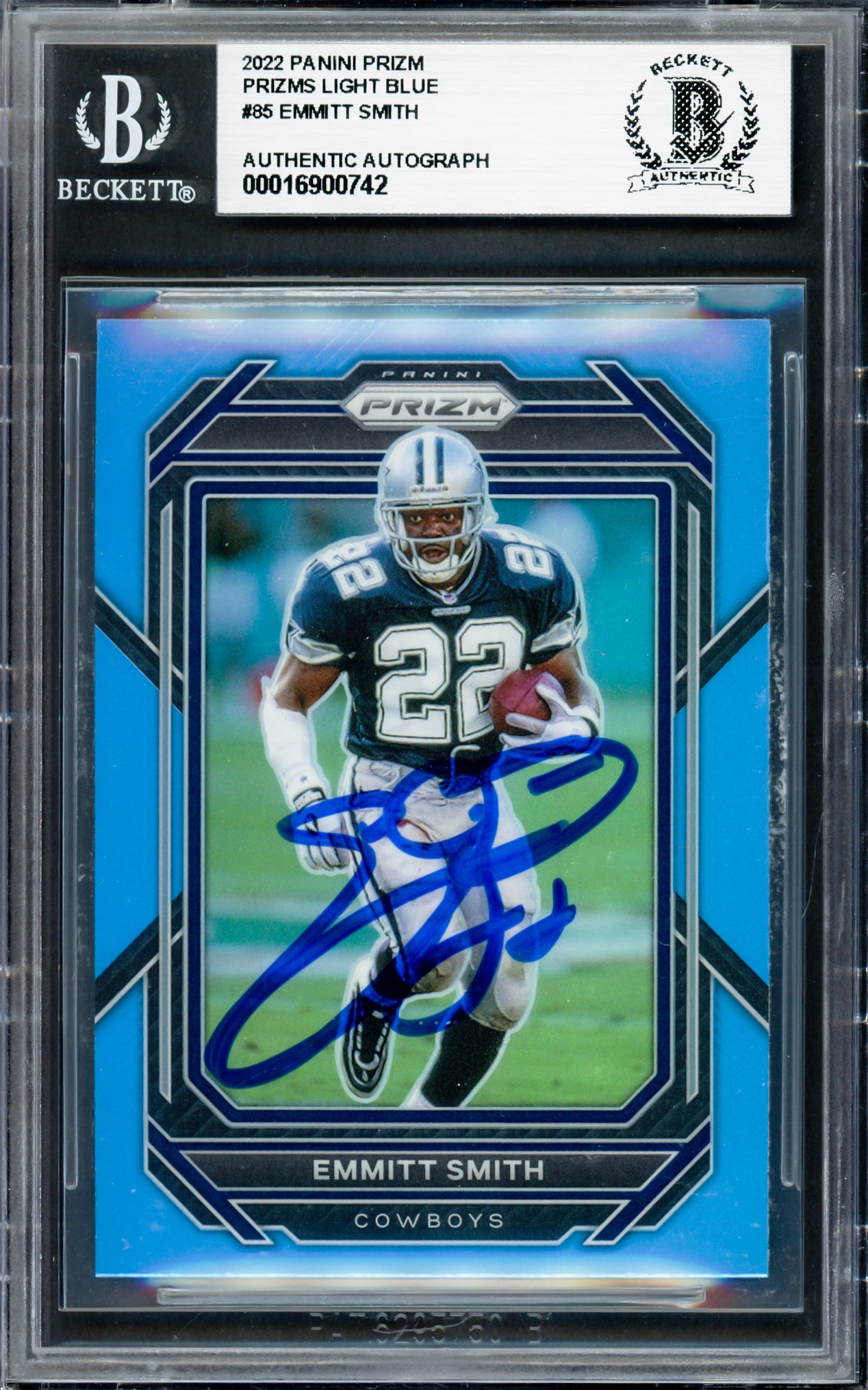 Emmitt Smith Autographed 2022 Panini Prizm Prizms Light Blue Card #85 Dallas Cowboys Beckett BAS #16900742
