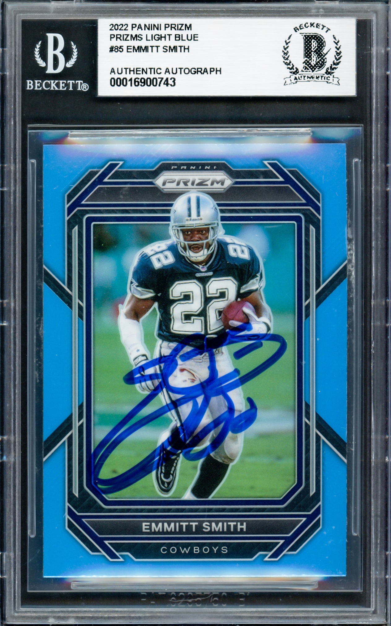 Emmitt Smith Autographed 2022 Panini Prizm Prizms Light Blue Card #85 Dallas Cowboys Beckett BAS #16900743