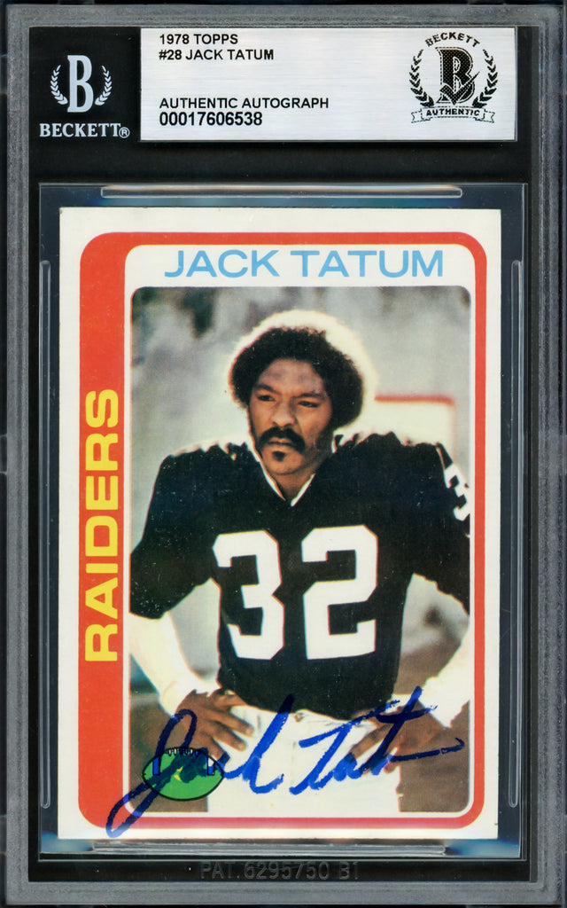 Own a piece of football history with this 1978 Topps Card #28, hand-signed by legendary defensive back Jack Tatum. Known for his hard-hitting style and fearless presence on the field, Tatum was a key player for the Oakland Raiders, leaving a lasting impact on the game. This collectible has been certified authentic by Beckett Authentication Services (BAS) and comes encapsulated in their tamper-proof holder for long-term preservation.