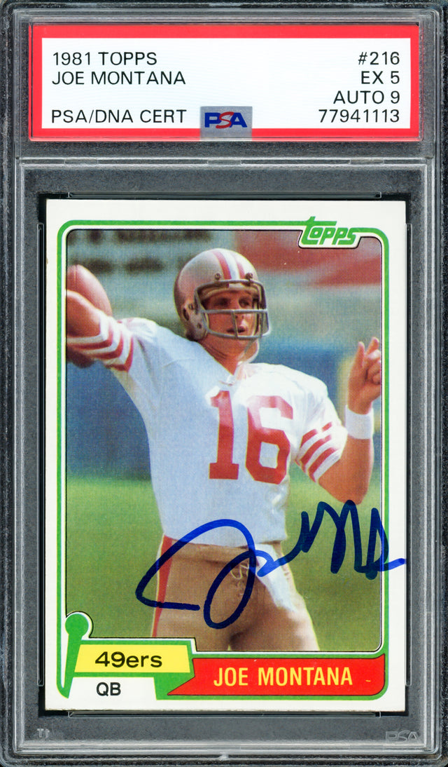 Joe Montana Autographed 1981 Topps Rookie Card #216 San Francisco 49ers PSA 5 Auto Grade Mint 9 PSA/DNA #77941113