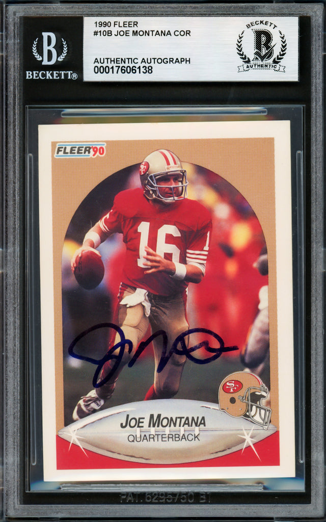Own a piece of football history with this 1990 Fleer Card #10, hand-signed by legendary quarterback Joe Montana. This rare collectible is a must-have for any serious sports memorabilia enthusiast or San Francisco 49ers fan. Authenticated by Beckett Authentication Services (BAS), this card comes securely encapsulated in BAS’s tamper-proof holder, ensuring its authenticity and long-term preservation.