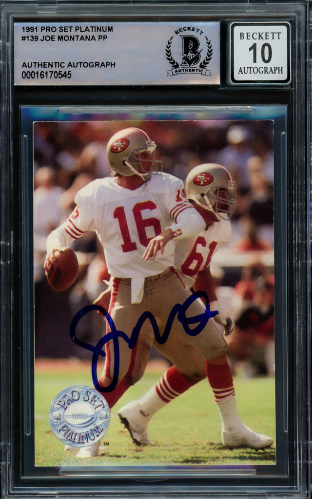 Own a piece of NFL history with this Joe Montana autographed 1991 Pro Set Platinum Card #139, a must-have for San Francisco 49ers fans and serious memorabilia collectors. This rare collectible features a Gem Mint 10-grade signature, authenticated by Beckett Authentication Services (BAS) under certification number #16170545. Encapsulated in a tamper-proof holder, this keepsake preserves Montana's legendary career in pristine condition.