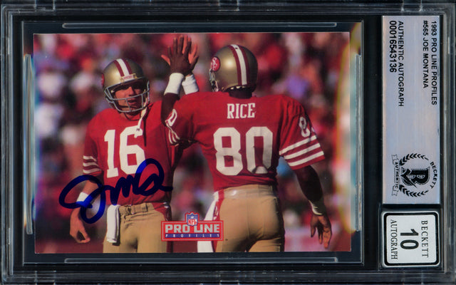 Joe Montana Autographed 1993 Proline Portraits Card #565 San Francisco 49ers Auto Grade Gem Mint 10 Beckett BAS Stock #229002 is backordered and will ship as soon as it is back in stock.