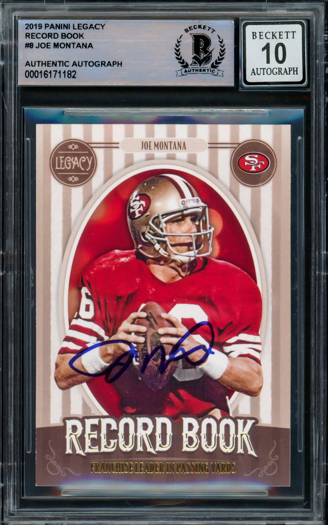 Elevate your memorabilia collection with this Joe Montana Autographed 2019 Panini Legacy Card #RB-JM, a prized item for dedicated San Francisco 49ers fans and football collectors. Featuring the legendary quarterback, this highly sought-after card is an iconic piece of NFL history. Authenticated and encapsulated by Beckett Authentication Services (BAS), the Gem Mint 10 signature grade guarantees its pristine condition and long-term value. The Panini Legacy series celebrates the sport’s greatest stars, making this card a standout addition to any collection.