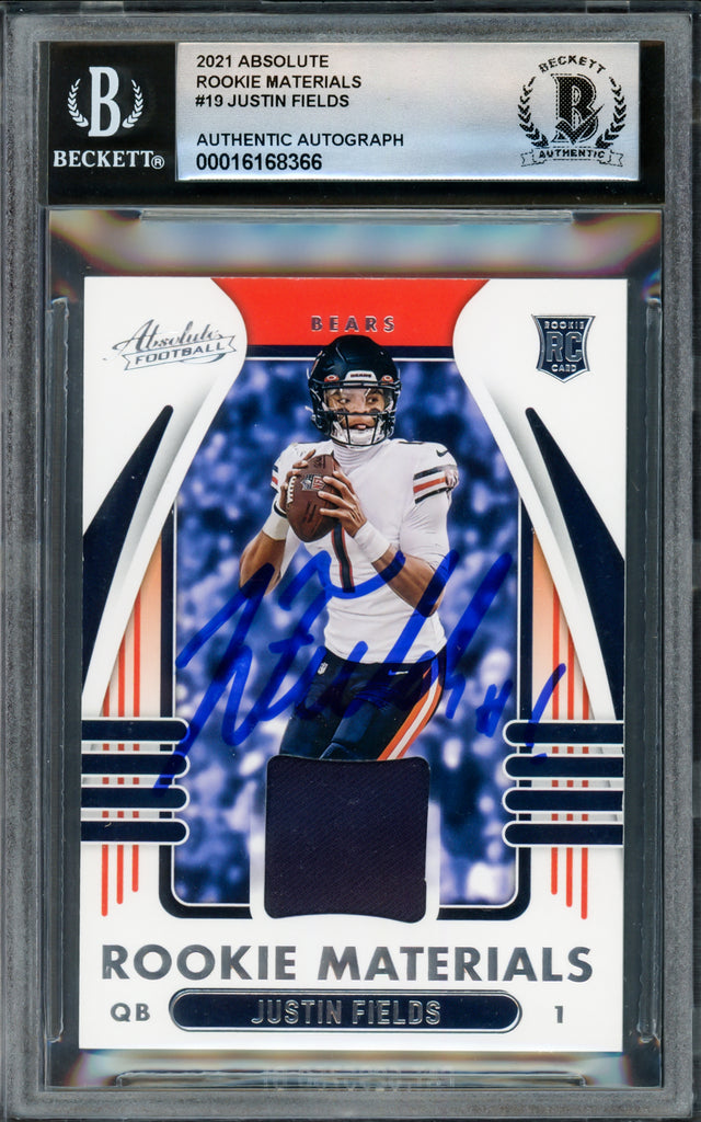 Justin Fields Autographed 2021 Absolute Jersey Patch Rookie Card #ARM-JFI Chicago Bears Auto Grade Gem Mint 10 Beckett BAS #16168366