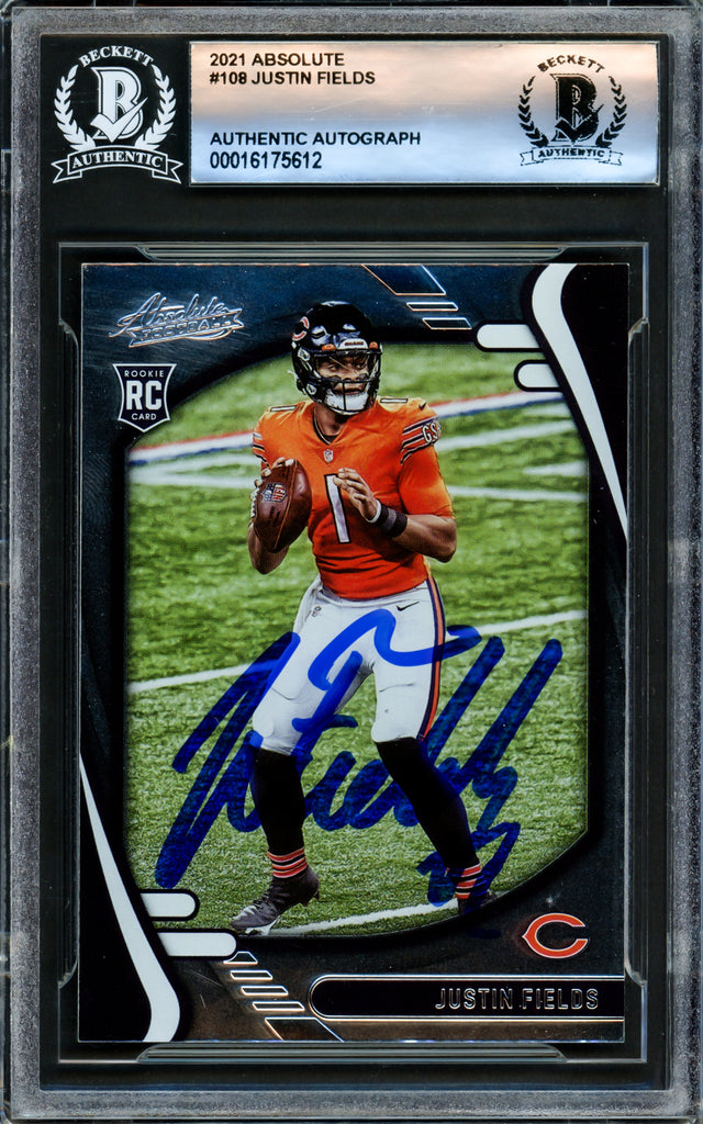 Own a piece of football history with this 2021 Absolute Rookie Card #108, hand-signed by Justin Fields. A must-have for collectors and Chicago Bears fans, this rookie card captures the early moments of one of football’s promising quarterbacks. Authenticated by Beckett Authentication Services (BAS), ensuring its legitimacy, this signed card is securely encapsulated in a tamper-proof holder for long-term preservation.