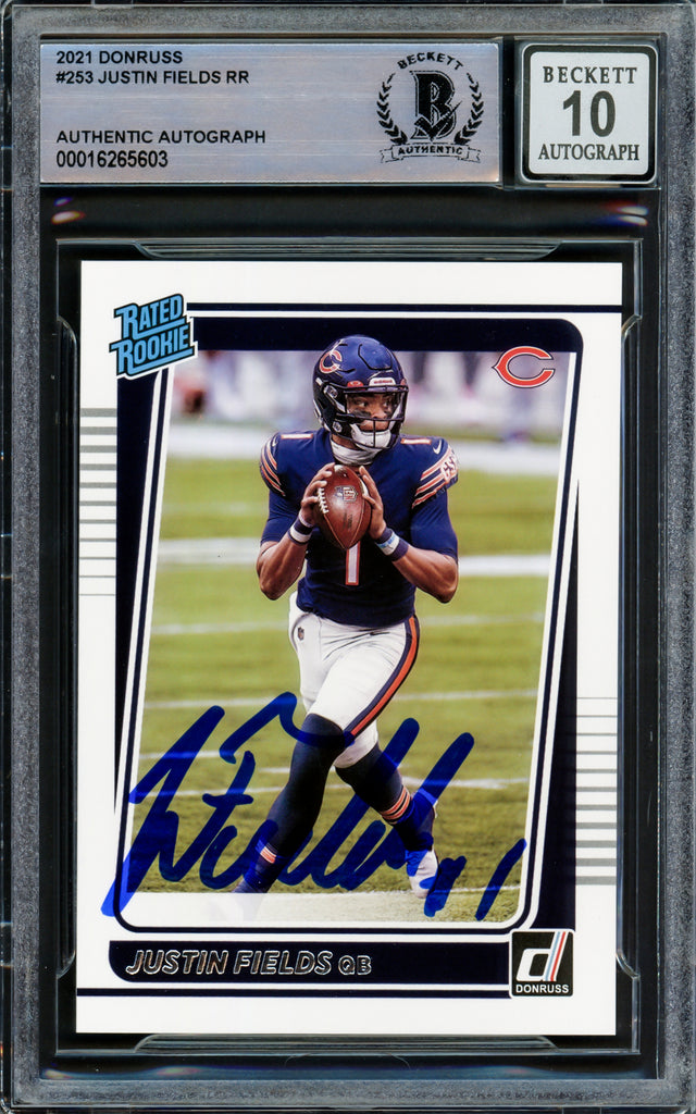 Justin Fields Autographed 2021 Donruss Rated Rookie Card #253 Chicago Bears Auto Grade Gem Mint 10 Beckett BAS Stock #221310