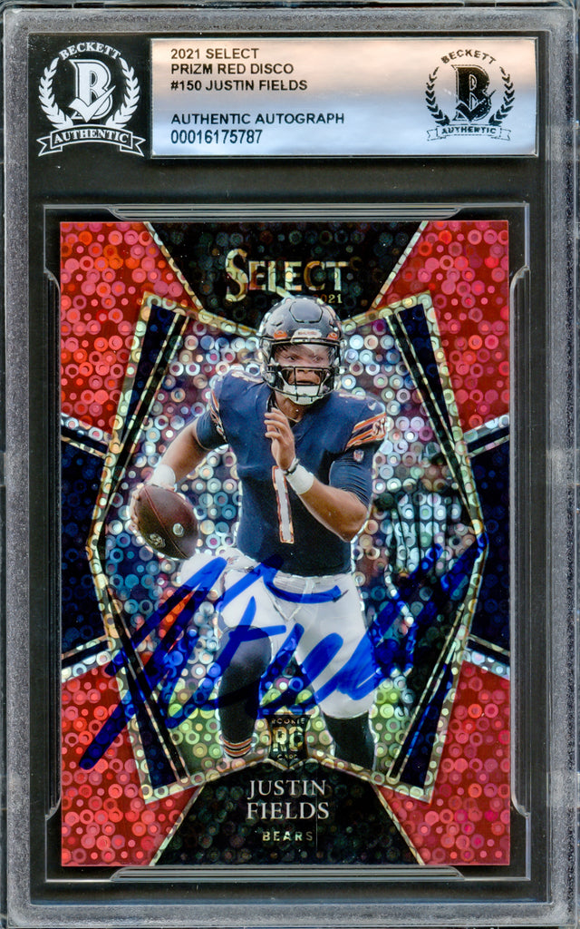 Justin Fields Autographed 2021 Select Red Disco Prizm Rookie Card #150 Chicago Bears #/49 Beckett BAS #16175787