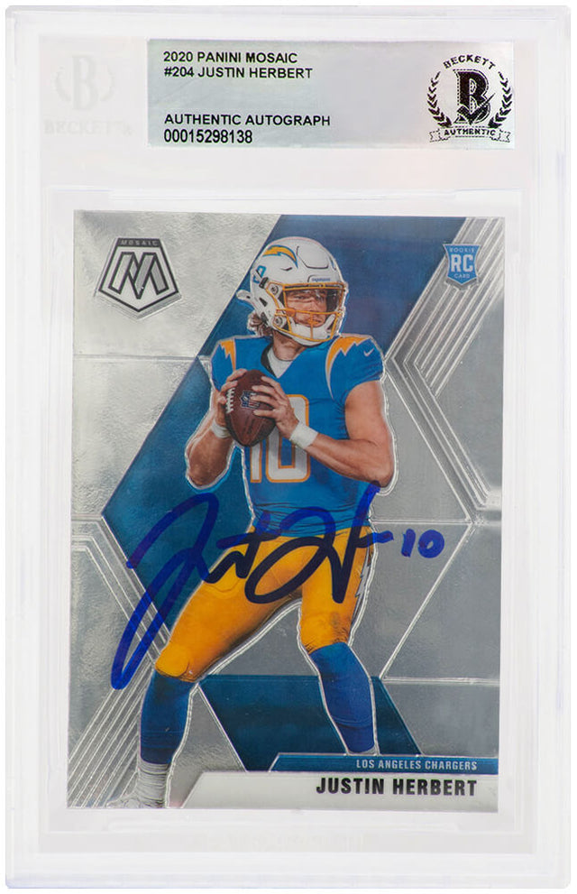 Capture a piece of NFL history with this Justin Herbert signed Los Angeles Chargers 2020 Panini Mosaic rookie football trading card #204. As one of the league’s most exciting young quarterbacks, Herbert made headlines during his spectacular 2020 rookie season—making this officially autographed card a must-have for any serious collector or Chargers fan. This trading card is not only a tribute to a breakout NFL star, but it's also a valuable investment-grade piece authenticated by one of the most trusted names in the hobby.