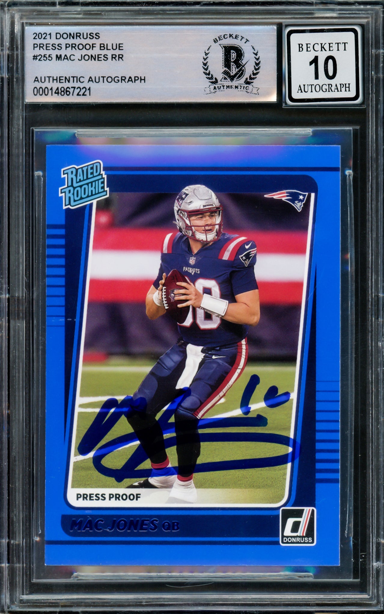 Mac Jones Autographed 2021 Donruss Rated Rookie Blue Press Proof Rookie Card #255 New England Patriots Auto 10 Beckett BAS Stock #210511 is backordered and will ship as soon as it is back in stock.