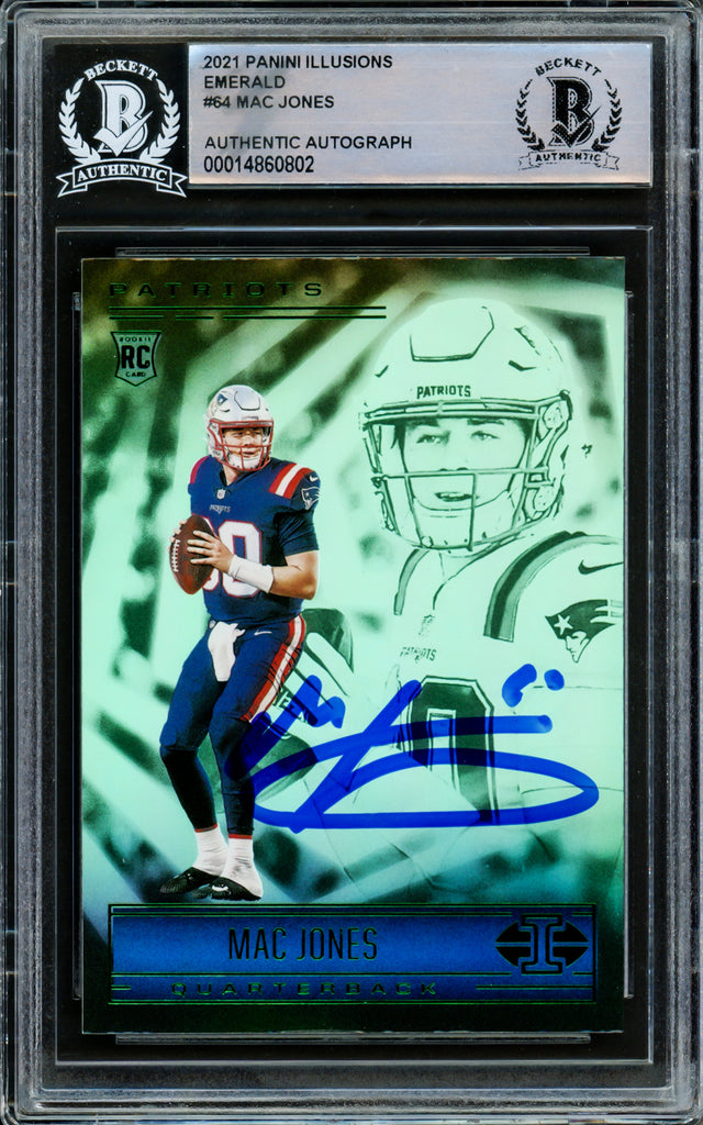 Own a piece of football history with this 2021 Panini Illusions Green Emerald Rookie Card #64, personally hand-signed by Mac Jones. This highly sought-after collectible is a must-have for New England Patriots fans and serious card collectors. It has been professionally authenticated by Beckett Authentication Services (BAS) and comes securely encapsulated in their tamper-proof holder to ensure its long-term preservation.