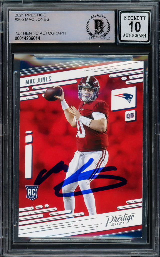 Mac Jones Autographed 2021 Panini Prestige Rookie Card #205 New England Patriots Auto Grade Gem Mint 10 Beckett BAS Stock #220339