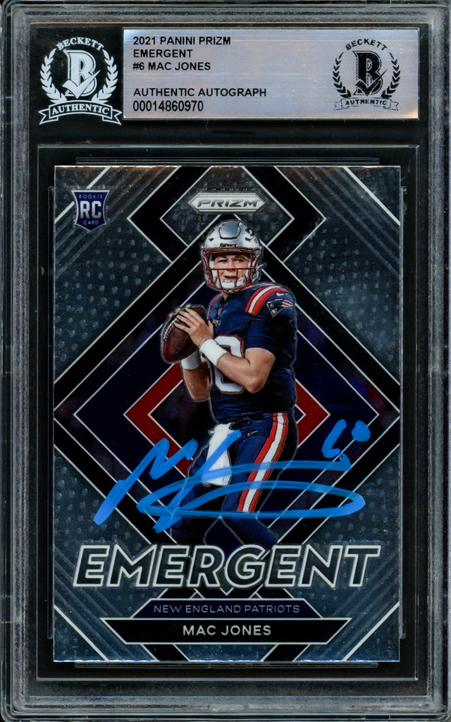 Mac Jones Autographed 2021 Panini Prizm Emergent Rookie Card #E-6 New England Patriots Beckett BAS #14860970 is backordered and will ship as soon as it is back in stock.