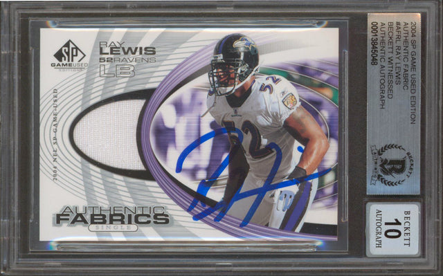Own a piece of football history with this Autographed Auto Graded Gem Mint 10! 2004 SP Game Used Edition Authentic Fabric #AFRL Card, personally signed by Ray Lewis—one of the most dominant linebackers in Baltimore Ravens history. This rare collectible is 100% authentic and comes slabbed and authenticated by Beckett Authentication Services, ensuring its legitimacy for serious collectors and fans alike.