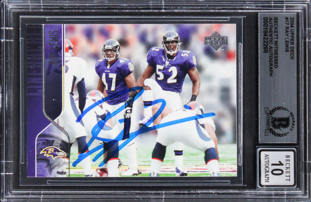 Celebrate the legendary career of one of the NFL’s most dominant defensive players with this Autographed Auto Graded Gem Mint 10! 2004 Upper Deck #17 Ray Lewis Card. Personally signed by Ray Lewis, iconic linebacker of the Baltimore Ravens, this rare collectible is a must-have for any serious football memorabilia collector or Ravens fan. Featuring a pristine Beckett-graded 10 autograph, this authenticated card captures a moment in time from Ray Lewis's legendary 2004 season, representing both elite performance and collectible excellence.