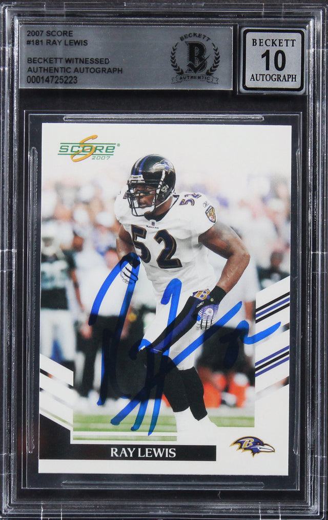 Own a piece of football history with this Autographed Auto Graded Gem Mint 10! 2007 Score #181 Ray Lewis Card. Personally signed by the legendary Ray Lewis of the Baltimore Ravens, this collectible is a must-have for serious fans and memorabilia enthusiasts. Encapsulated and authenticated by Beckett Authentication Services (BAS), this rare item guarantees 100% authenticity, which can be verified on the Beckett website.