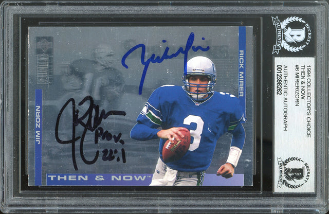Own a piece of Seattle Seahawks history with this Autographed 1994 Collector's Choice Then & Now #6 Card, personally signed by Rick Mirer and Jim Zorn. This rare collectible showcases the legacy of two standout Seahawks quarterbacks, making it a must-have for any dedicated fan or memorabilia collector. Authenticated by Beckett Authentication Services, ensuring 100% authenticity.