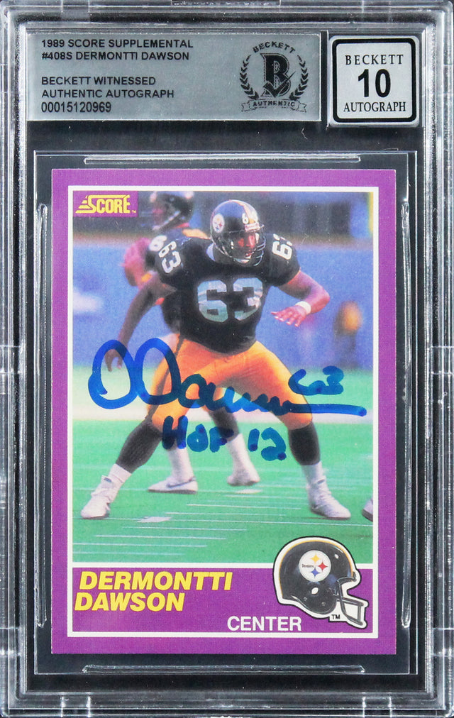 Own a piece of football history with this Autographed Auto Graded Gem Mint 10! 1989 Score Supplemental #408S Rookie Card, personally signed by Dermontti Dawson of the Pittsburgh Steelers. A true gem for collectors, this card features Dawson’s signature along with the "HOF 12" inscription, celebrating his Hall of Fame induction. Certified 100% Authentic by Beckett Authentication Services (BAS), this collectible comes professionally slabbed for long-term preservation.