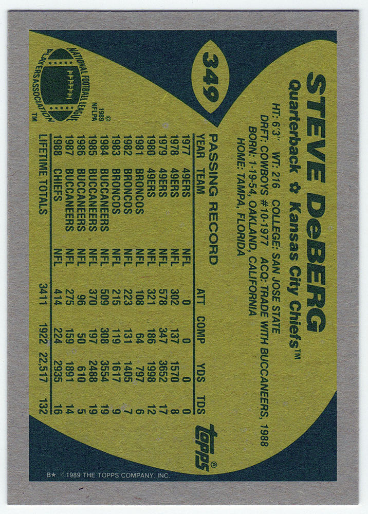 Steve Deberg Signed Kansas City Chiefs 1989 Topps Football Trading Card #349