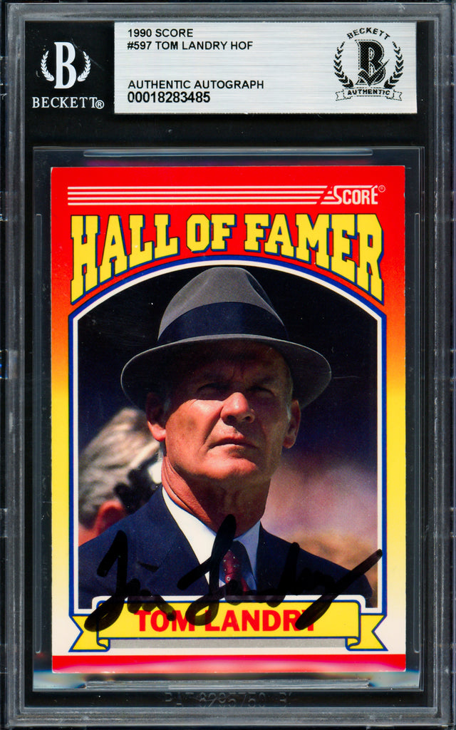 Celebrate one of the most legendary figures in NFL history with this iconic 1990 Score Card #597, personally hand signed by Tom Landry. Best known as the innovative and stoic head coach of the Dallas Cowboys, Landry led the team to two Super Bowl championships and cemented his place in football history. This collectible card captures the timeless legacy of a man who revolutionized the game and is a must-have for serious NFL memorabilia collectors. Authenticated by Beckett Authentication Services (BAS) and encapsulated in their tamper-proof holder, this piece guarantees long-term preservation and value.