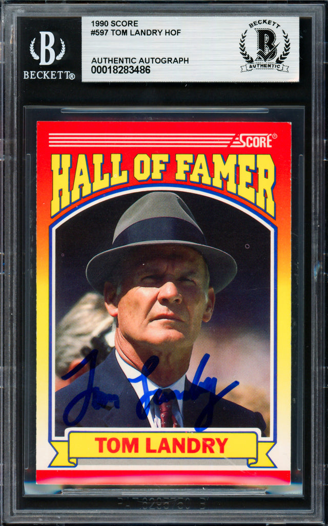 Own a legendary piece of football history with this 1990 Score Card #597 hand-signed by Tom Landry, the iconic coach who led the Dallas Cowboys for 29 seasons and helped shape the modern NFL. This collectible captures a pivotal era in football and is a must-have for serious fans and collectors. The autograph has been authenticated by Beckett Authentication Services (BAS) and is secured in their tamper-proof encapsulated holder, ensuring long-term preservation and value. Whether you're a Dallas Cowboys loyalist or a fan of NFL history, this signed card commemorates the legacy of one of the game’s all-time greats.