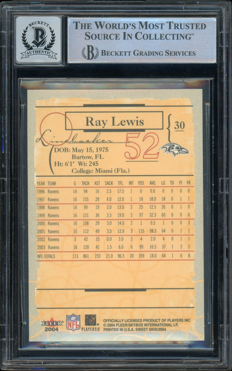 2004 Fleer Sweet Sigs #30 Ray Lewis Baltimore Ravens BGS Autograph 10