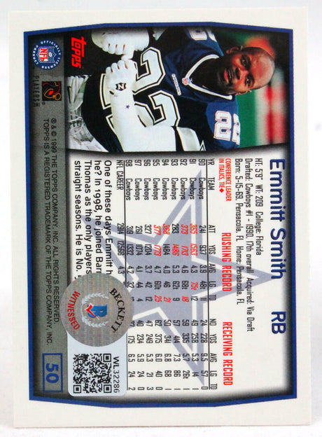 1999 Topps #50 Emmitt Smith Cowboys Autograph Beckett Witness